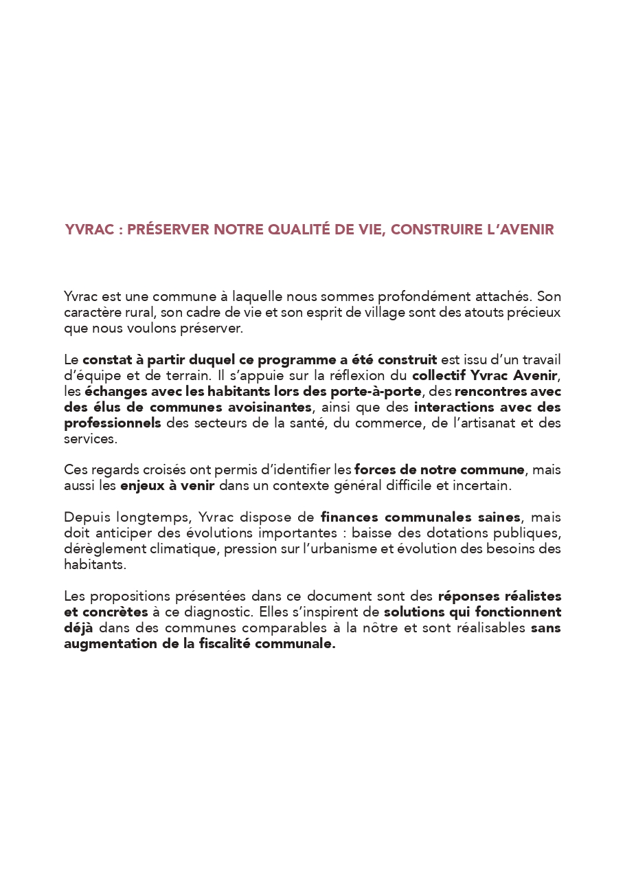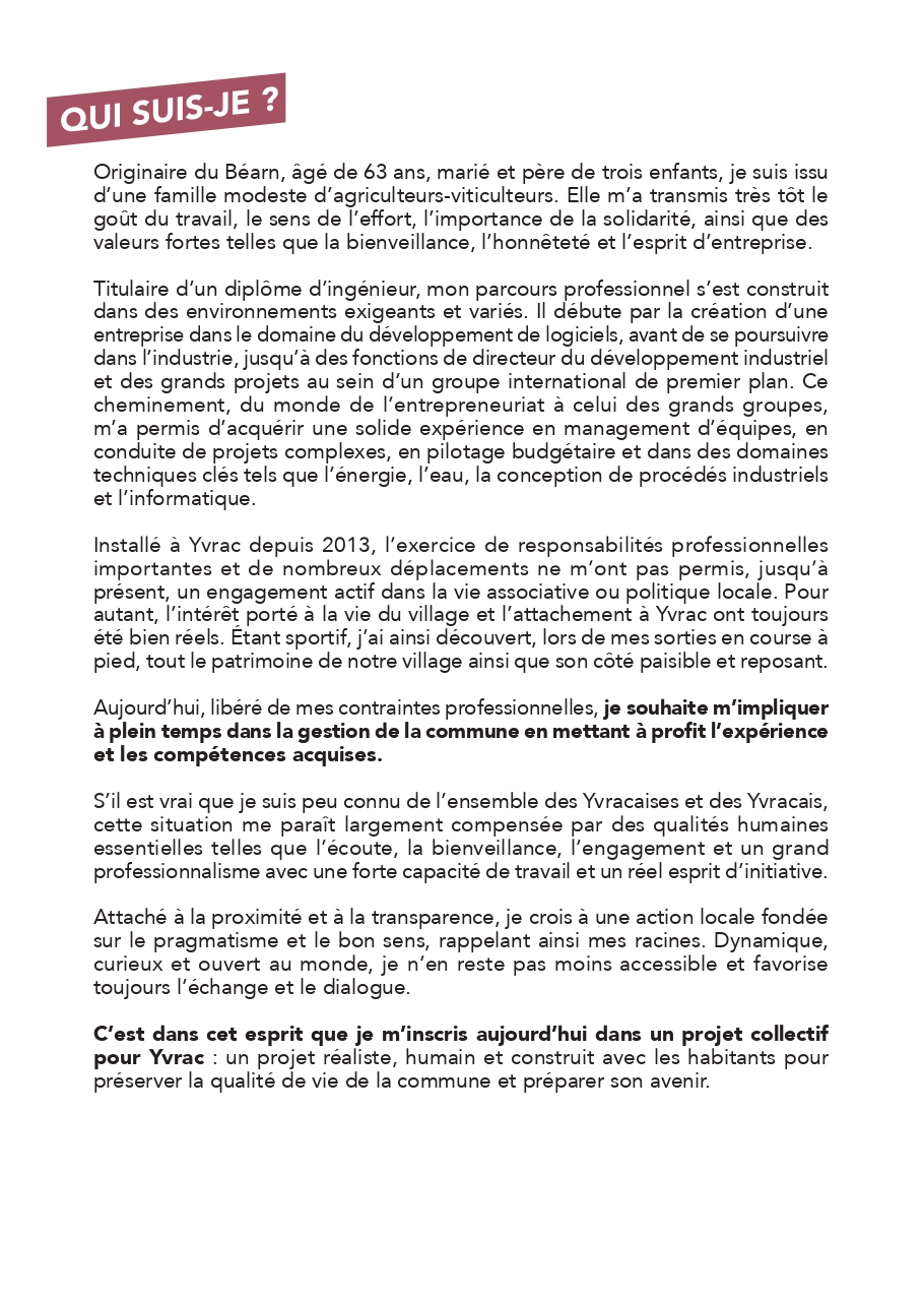 Parce que je suis profondément attaché à Yvrac, parce que je souhaite le meilleur pour notre commune, je me présente devant vous, entouré d’une équipe citoyenne apolitique : Yvrac Avenir.